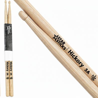 StarSticks 5A Hickory — універсальна модель для рок/поп/ф’южн, оркестрової та студійної роботи: передбачувана віддача, чистий відскок і читабельний звук на тарілках.